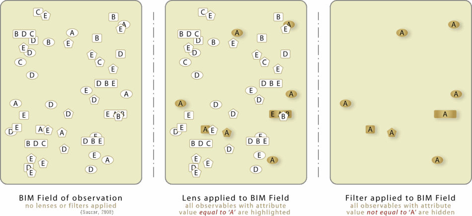 Lenses and Filters are investigative tools of enquiry and domain analysis allowing the discovery of concepts and relations. The difference between (BIM) Lenses and Filters can be summarised as such: Lenses are additive and are deployed from the ‘investigator’s side’ of BIM Field observation while Filters are subtractive and are deployed from the ‘data side’. Lenses highlight observables that meet …