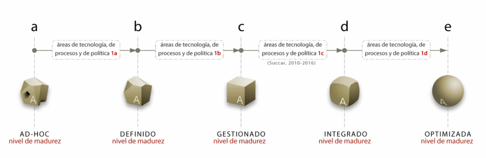 The BIM Maturity Index (BIMMI) is a conceptual model depicting five distinct Maturity Levels: (a) Initial/ Ad-hoc, (b) Defined, (c) Managed, (d) Integrated and (e) Optimized.
