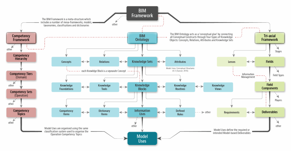 The conceptual hierarchy provided clarify how Model Uses are derived through three different conceptual routes: the Tri-Axial Framework, Competency Framework, and BIM Ontology.