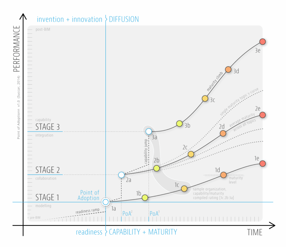 The Point of Adoption Model highlights how capability stages and maturity levels are used to assess/facilitate BIM implementation within organization and – in combination with other Framework parts – BIM diffusion across markets.