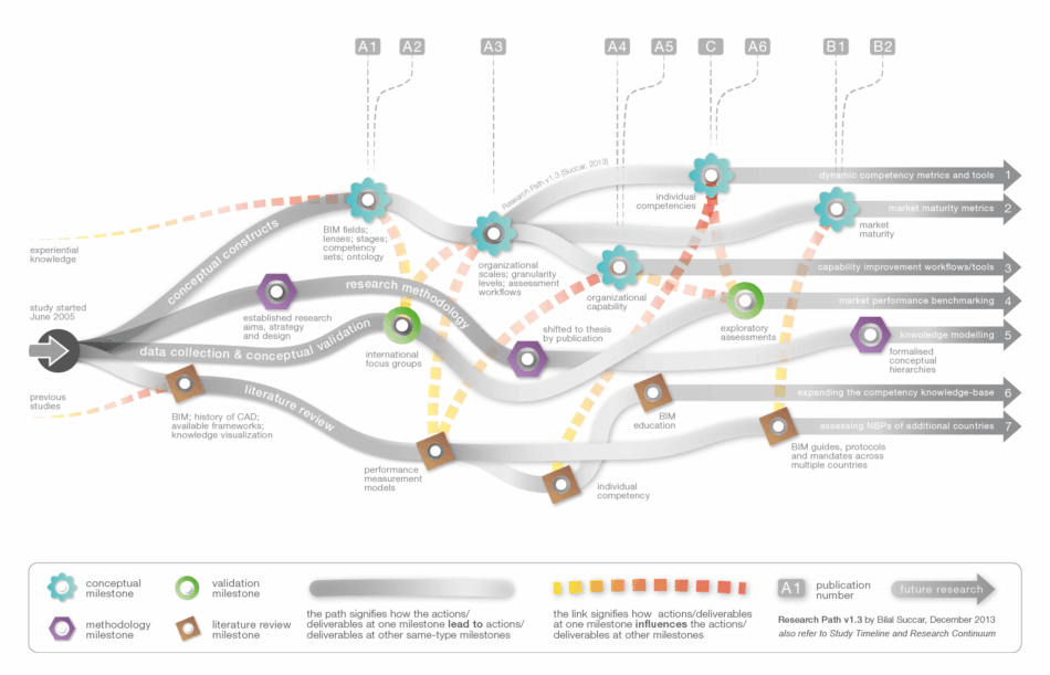 The Research Path (Succar, 2013) identifies the major milestones along four research sub-paths: literature review, research methodology, conceptual development and data collection.