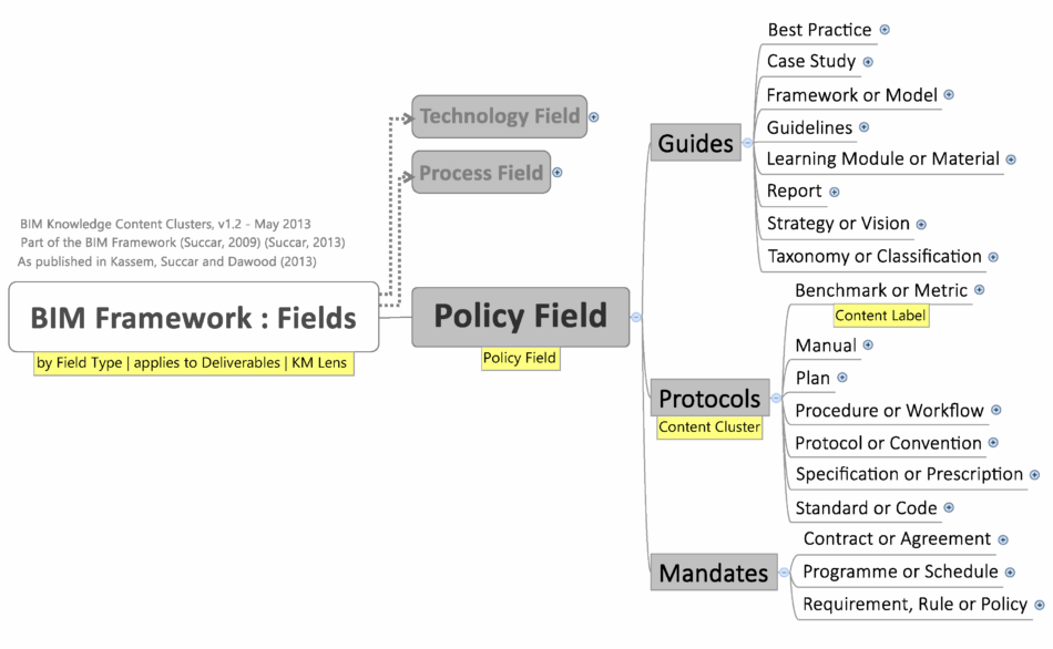 Click of a larger version | older versions: v2.0 – 2010, v1.2 – 2008 and v1.1 – 2007 Also available in Spanish, German, Italian and French This conceptual model represents BIM Fields, the first dimension of the Tri-axial Model. BIM Fields refer to all topics, activities, and actors across the BIM domain. The Venn diagram (three overlapping circles) identifies Field Types (Technology, Process and Policy), Field Components (Players, Deliverables …