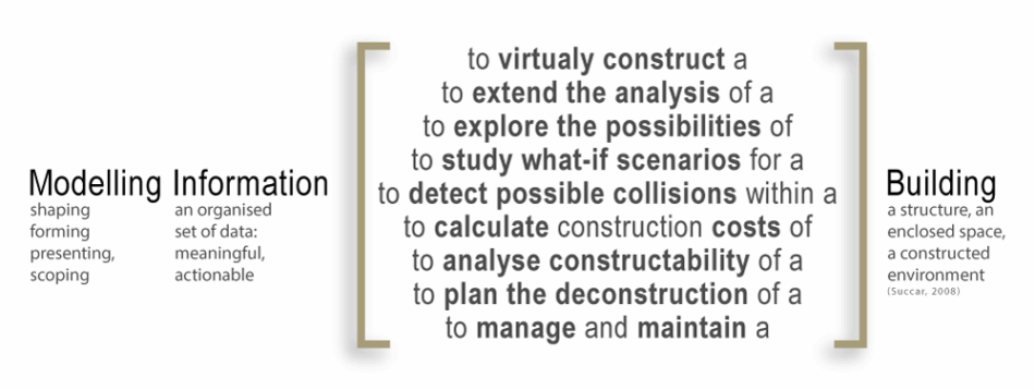 One of the easiest ways to explain the meaning of BIM to non-specialists is by flipping the term around from Building Information Modelling (BIM) to modelling information to perform a function related to buildings. The functional use of information is later formalised through the term Model Uses and represented by the Model Use Wheel.