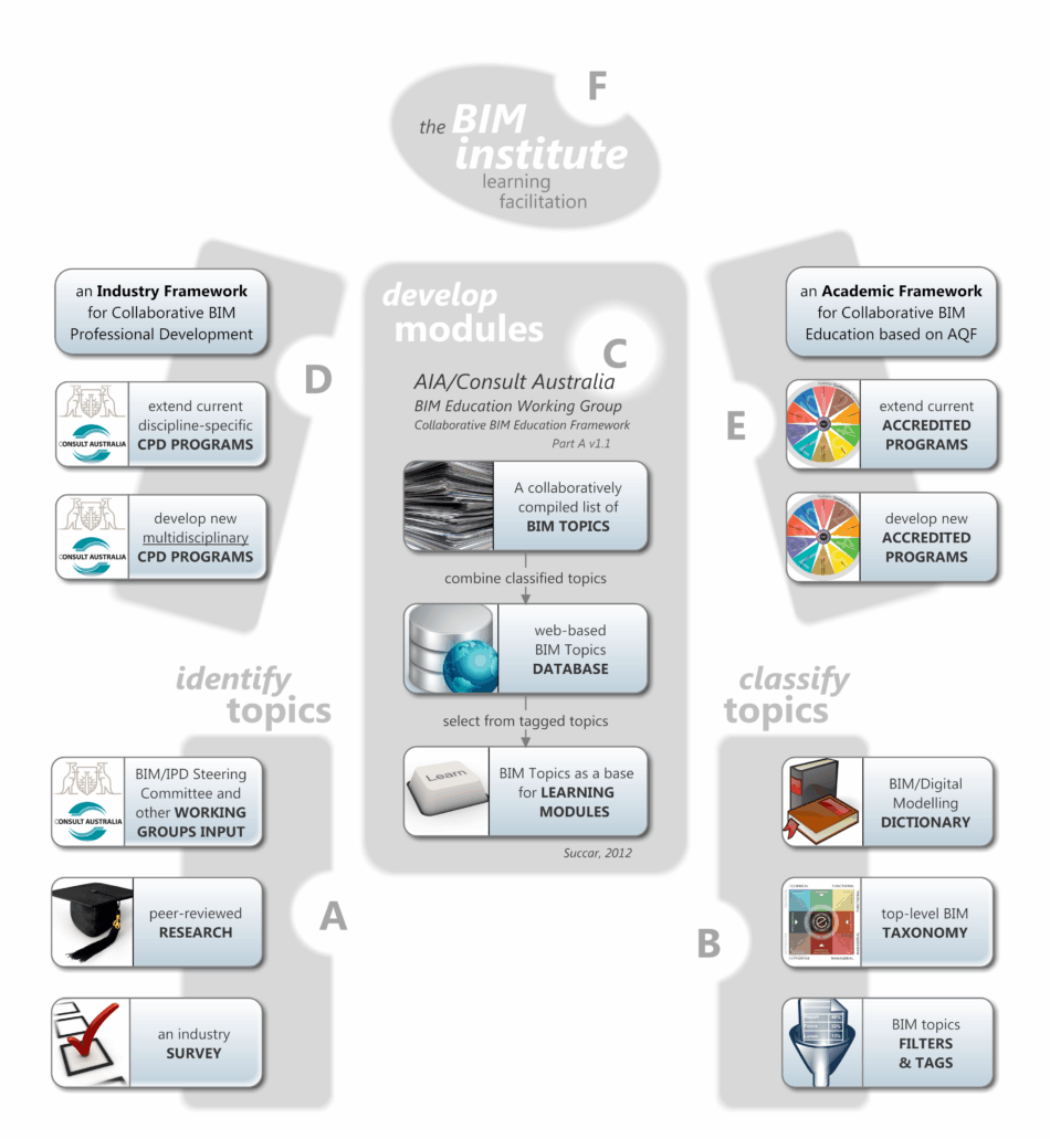 The collaborative education framework (CEF) has been developed as a joint effort between academia and industry in Australia. CEF was first published as part of the AIA/CA BIM in Practice, BIM Education position papers (AIA/CA, 2012) and is built around the principles, models, taxonomies, and classifications of the BIM Framework. CEF includes six main complementary components.