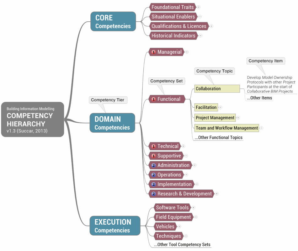 The BIM Competency Hierarchy includes three BIM competency tiers which are divided into several BIM competency sets which are, in turn, subdivided into BIM competency topics. These tiers, sets, topics – and their granular subdivision into competency items – represent all the measureable abilities, outcomes and activities of individuals who deliver model-based products and services.