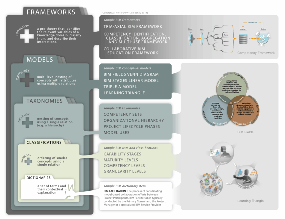The BIM framework is a collection of interrelated conceptual constructs – models, taxonomies, classifications, and dictionaries – glued together by a common conceptual ontology.