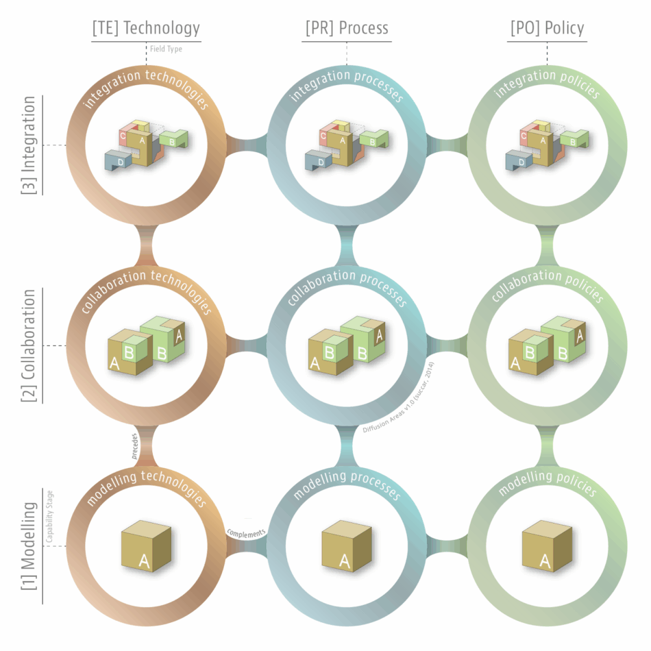 This Diffusion Areas model/matrix/chart clarify how BIM Field types interact with BIM Capability Stages to generate nine areas for targeted BIM diffusion analysis and BIM diffusion planning.