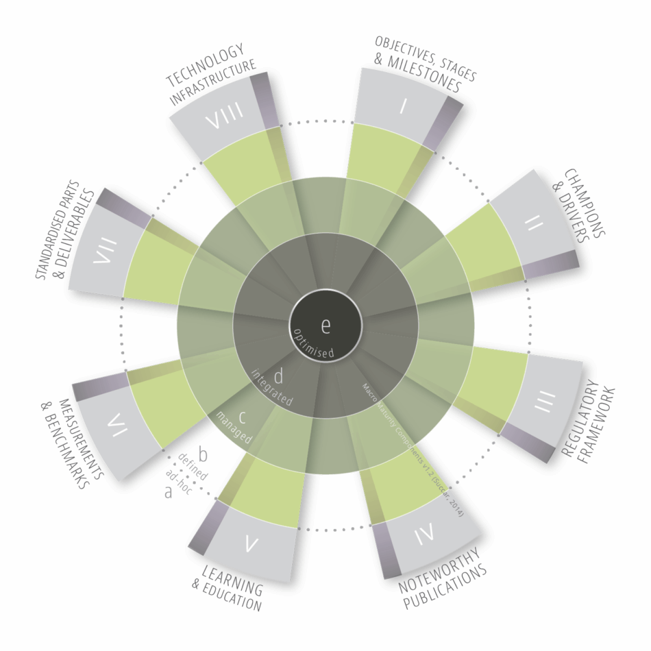 The Macro Maturity Components model identifies eight complementary components for measuring and establishing the BIM maturity of whole markets.