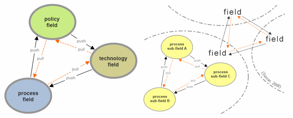 BIM Interactions are push-pull knowledge transactions occurring within or between BIM Fields and sub-Fields. Push mechanisms transfer knowledge to another field or sub-field while pull mechanisms transfer knowledge to satisfy a request by another field or sub-field. Sample transactions include data transfers, team dynamics and contractual relationships between fields and sub-fields. Policy Field Process Field Technology Field Sample interactions between …