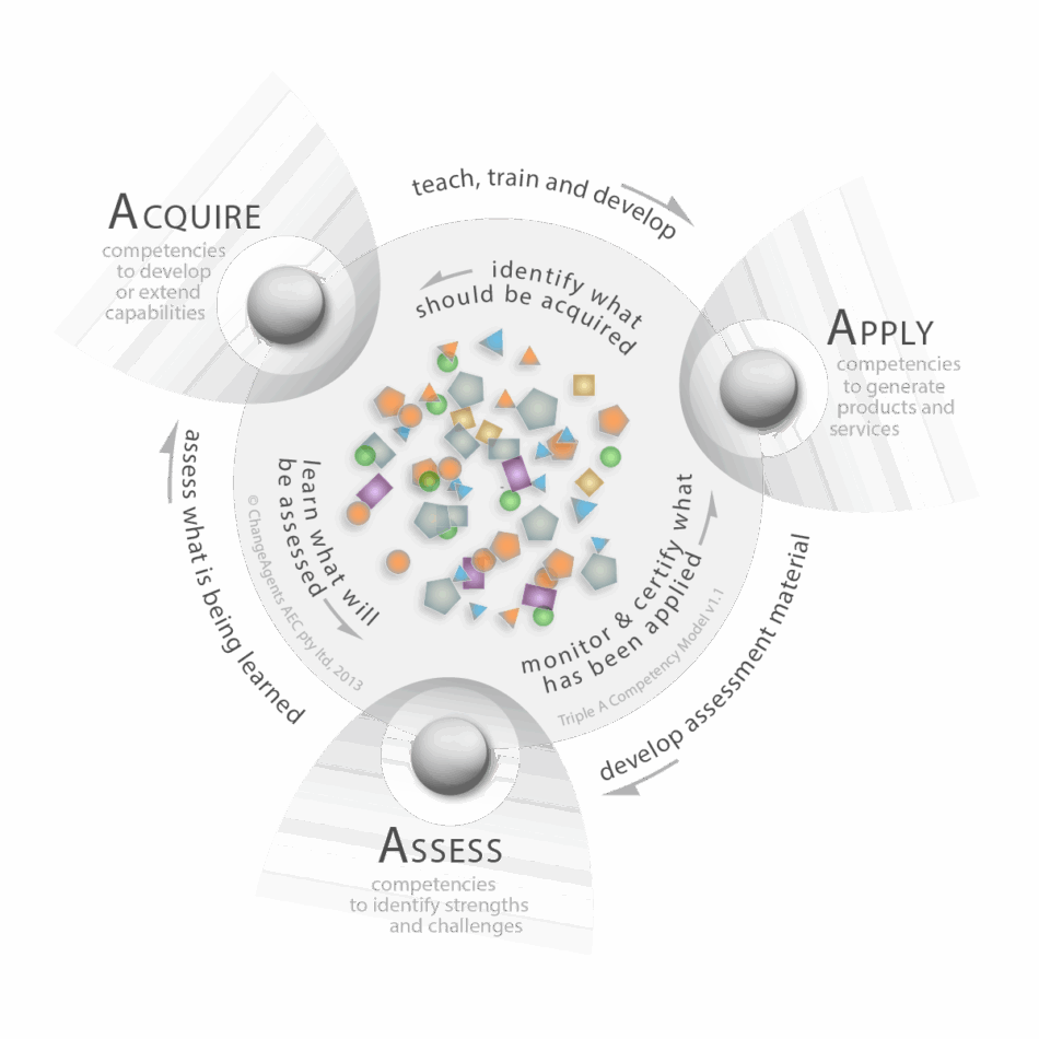 The Triple A Competency Model is a knowledge engine which uses structured BIM competency items to perform three complementary actions: competency Acquisition, competency Application and competency Assessment.