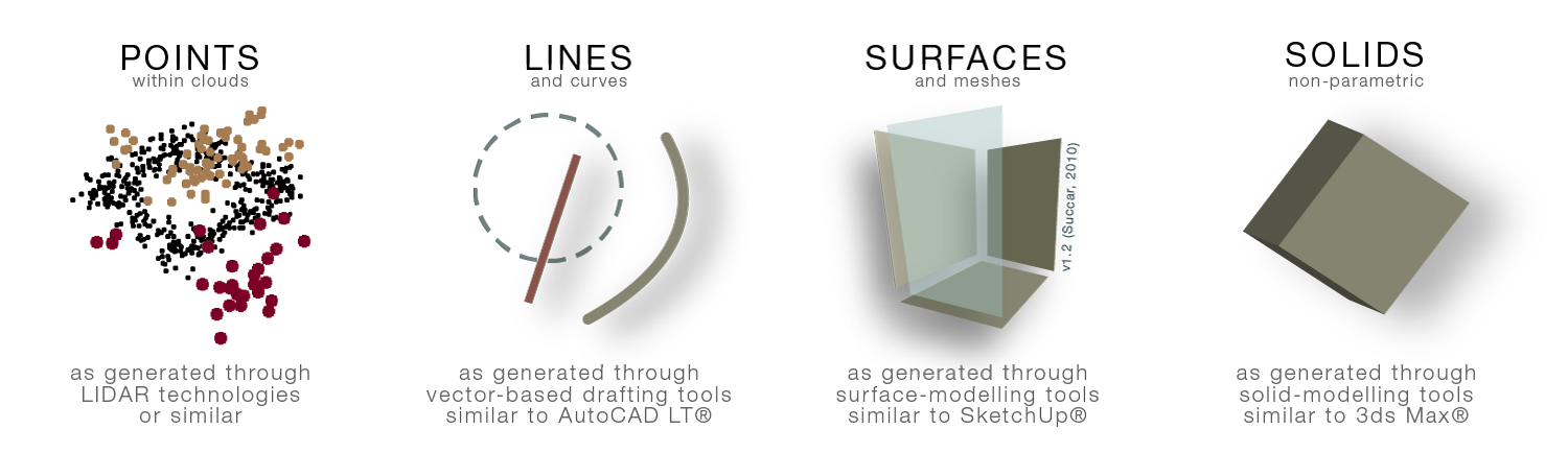 Again, the above attributes are the inclusive definitions of a BIModel. Needless to say, each proprietary and non-proprietary BIM package adds its own qualifications to the attribute pool in an attempt to squeeze its conceptual and commercial competitors out of the BIM acronym itself. Whether a package is interoperable, fully parametric or allows digital fabrication output has nothing to do with the inclusive set but are additional (and highly welcome) attributes. Exclusive definitions (those that exclude others) are quite simple: Surface Modellers (like SketchUp® for example), Entity-Based Modellers (like 3D AutoCAD®) and Geometric Modellers (like Autodesk® VIZ) do not qualify as a BIModellers. The exclusion is also passed onto 3D object-based platforms that are outside the Architectural Engineering and Construction domain (like SolidWorks®, Solid Edge® and Inventor®).
